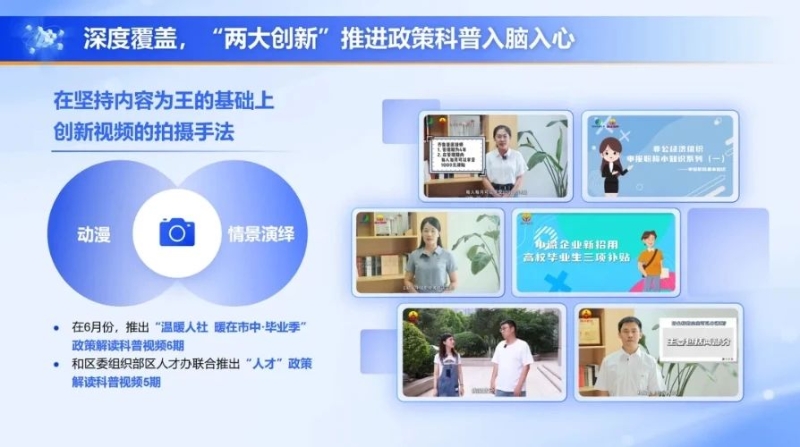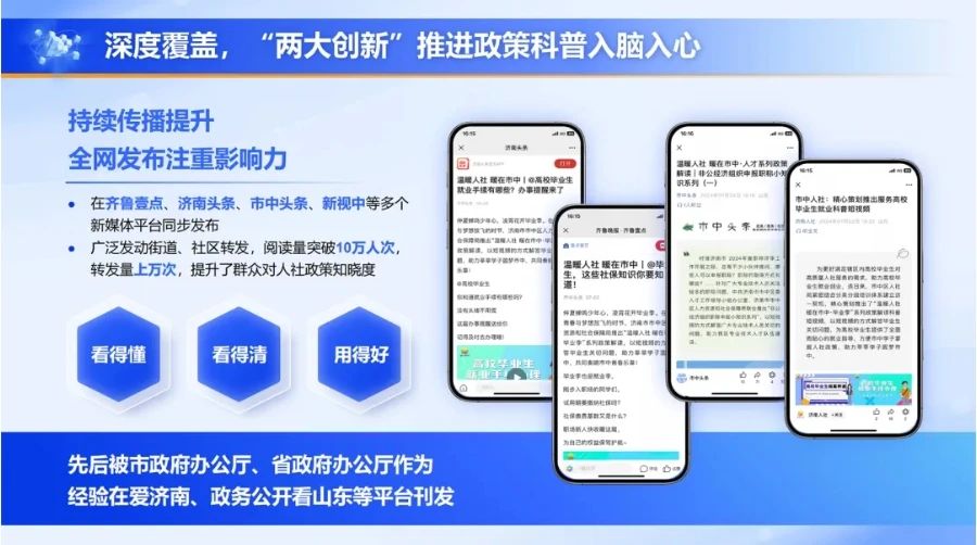 同时,为让群众能够及时享受到人社惠民惠企政策,在传统的对内培训基础之上,进一步拓宽思路,适时根据公众对人社相关政策的需求和关切的问题,创新推出科普短视频,采取动漫、情景演示等通俗易懂的形式,以其生动活泼的画面、简单明了的语言、喜闻乐见的形式,使公众更易了解、更易掌握政策。目前,已根据高校毕业生毕业季需求,推出6期毕业季系列政策解读科普短视频;根据人才政策需求,推出5期人才系列政策解读科普短视频。在齐鲁壹点、市中头条等多个新媒体平台同步发布投放,广泛发动街道、社区转发,阅读量突破10万人次,转发量上万次,有效提升了群众对人社政策知晓率。创新经验做法,先后被省、市政府办公厅作为经验在政务公开看山东等平台刊发。
