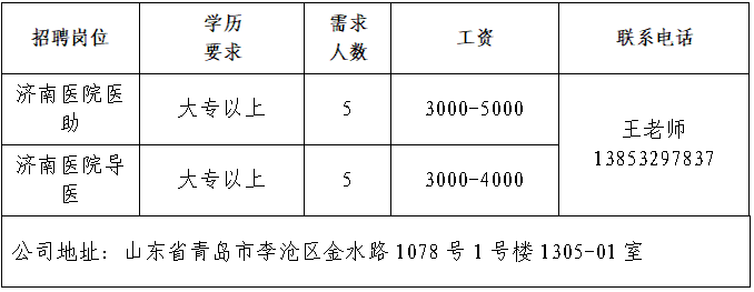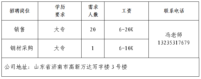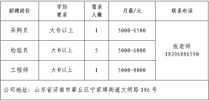 山东彗鸢健康科技有限公司山东彗鸢健康科技有限公司是一家从事健康卫护,智能健康穿戴设备与康护机器人研发、生产,卫护智能诊断大模型建设,健康智能管理服务和先进文化传播的科技企业。济南达通物资有限公司济南达通物资有限公司,是一家集钢材进出口贸易、加工、配送于一体的综合性企业,特别是与山钢、莱钢、日钢、普阳、邯钢、津西等各大钢厂建立了长期稳定的合作关系,货源充足,品种规格齐全。公司主营中厚板、容器板、型材工、角、槽钢、冷热轧卷板、H型钢等。青岛济康医疗服务有限公司青岛济康医疗服务有限公司是一家专门从事医疗服务,提供专业医院管理,病人陪护服务,护理机构服务的医疗公司。山东亚飞特金属制品有限公司公司成立于2006年,是集研发、生产、加工、销售、国际贸易于一体的大型公司。中国人寿BBC战略客户服务部中国人寿寿险是中国最大的国有金融保险集团之一,业务涵盖保险、投资和银行等多个领域。济南鑫塞维精密机械有限公司济南鑫塞维是为服务客户汇川在济南投资设立的首家新公司,厂区位于章丘区宁家埠,紧邻高速路口,地理位置优越,交通便捷。厂区总占地面积18000平方米,建筑面积15800平方米。项目一期总投资5000万元。上海赢可通信息科技有限公司营客通(上海赢可通信息科技有限公司)成立于2015年,总部位于上海,是国内领先的家电新零售生态服务平台。山东燕沅人力资源有限公司山东燕沅人力资源有限公司成立于2011年,总部位于省会济南。企业报名参加招聘,求职者咨询更多招聘岗位信息请致电市人力资源市场:★ 济南市人力资源市场(地址:历城区七里河路2-2号)联系人:王老师 联系电话:0531-61317807