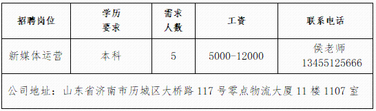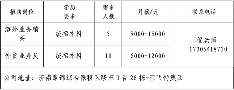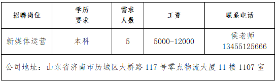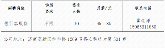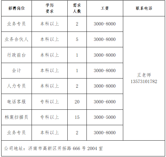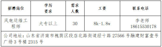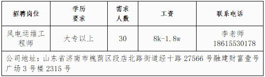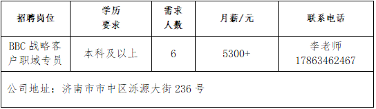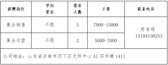济南瑞柏新能源技术有限公司公司成立于2017年,总部在成都,在山东、江苏、福建等省市设有分公司,是我国专业化新能源风电运维、定检、技改、技术研发与利用的知名电力企业。山东雅利安供应链管理集团有限公司公司是国家高新技术企业、农业重点龙头企业、山东知名品牌、中国物流实验基地、国家AAAA级综合物流企业、中国AAAAA星级仓库、国家AAA级绿色仓储、山东省城乡高效配送示范企业、山东省供应链信息化示范企业。青岛济康医疗服务有限公司青岛济康医疗服务有限公司是一家专门从事医疗服务,提供专业医院管理、病人陪护服务、护理机构服务的医疗公司。山东亚飞特金属制品有限公司公司成立于2006年,是集研发、生产、加工、销售、国际贸易于一体的大型公司。中国人寿BBC战略客户服务部中国人寿寿险是中国最大的国有金融保险集团之一,业务涵盖保险、投资和银行等多个领域。济南万和企业咨询有限公司公司成立于2009年,注册资本6100万元,专业从事金融外包业务。山东思创国际会展有限公司山东思创国际会展有限公司是会展行业服务商,现拥有:济南链宠会、郑州宠物展、西安宠物展、青岛宠物展等全国宠物系列展,北京餐饮采购展览会,沈阳餐创展,济南好餐饮食材展,华餐会-世界餐饮企业家俱乐部。山东燕沅人力资源有限公司山东燕沅人力资源有限公司成立于2011年,是在《国家第十三个五年规划纲要》关于促进就业规划、提升人才保障国家战略背景中成立的。公司总部位于省会济南。企业报名参加招聘,求职者咨询更多招聘岗位信息请致电市人力资源市场:★ 济南市人力资源市场(地址:历城区七里河路2-2号)联系人:王老师 联系电话:0531-61317807