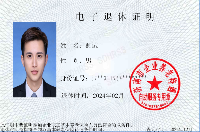 (一)电子退休证明“爱山东”APP展示样式(见附件1),底板以第三代社会保障卡的水波纹为基础,增加SDHRSS底纹。标题“电子退休证明”为华文中宋,正文信息栏、注释信息栏为宋体。照片调取自社会保障卡照片。正文信息包括姓名、性别、身份证号码、退休时间(精确到年月),加盖“济南市企业养老待遇自助服务专用章”,注释“此证明主要证明参加企业职工基本养老保险人员已符合待遇领取条件”“退休时间是指符合领取基本养老保险待遇条件时间”和“查询时间”内容。