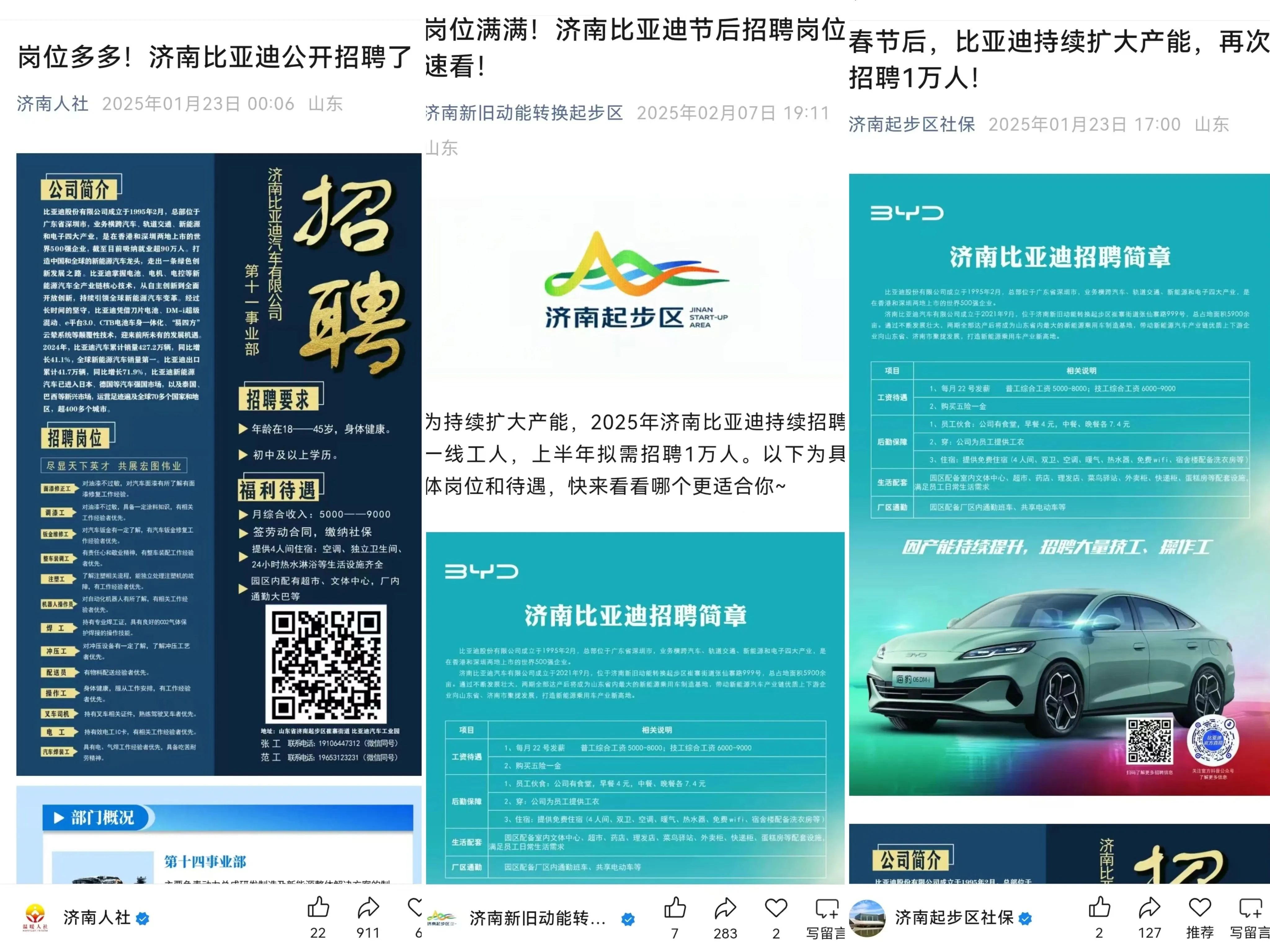 为持续扩大招聘宣传面,社会事业部创新运用媒体传播手段进行“引流量”。策划制作的比亚迪招工视频,通过爱济南、“济南人社”及“齐鲁零工”等线上招聘平台开展线上宣传;同时,协调“省会经济圈”求职招聘服务联盟建立用工协同机制,联动济南周边6市开展跨区域定向招聘,有效拓宽了比亚迪技术工人的输送渠道。