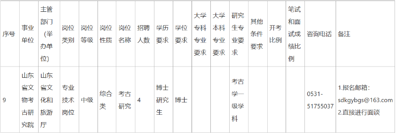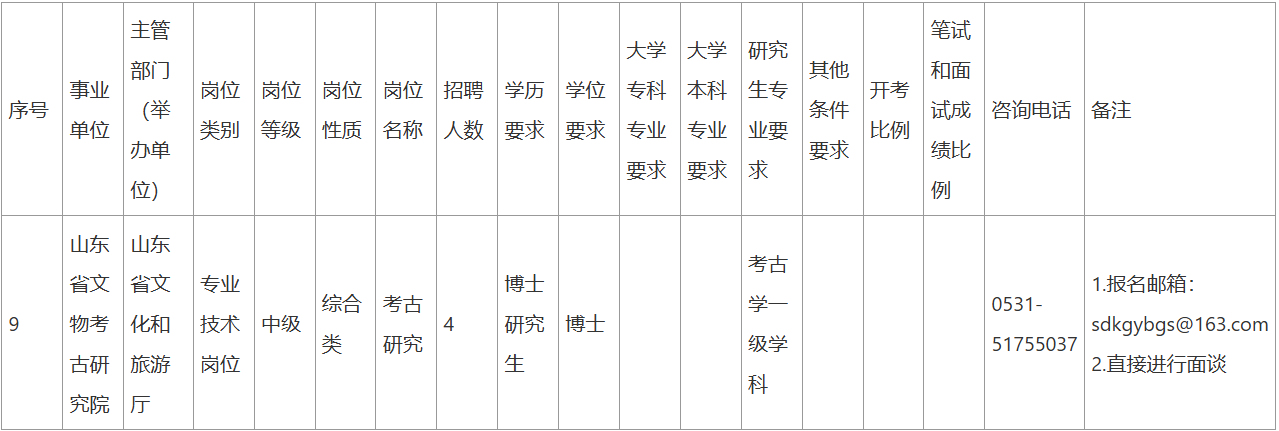 山东省文物考古研究院成立于1981年,是山东省文化和旅游厅所属正处级公益一类事业单位。其前身为1948年成立的山东古代文物管理委员会,2017年更名为山东省文物考古研究院。2022年4月经省编办批准,山东考古博物馆正式挂牌。主要承担全省地下文物的调查、勘探、发掘、保护、研究等工作,承担全省石窟寺保护、研究、利用工作,承担考古成果的阐释、传播等工作,承担考古科学展示宣传教育等工作。具有国家文物局颁发的考古发掘团体领队资质,24人具有田野考古发掘项目负责人资格。全院核定编制132人,目前在编在职115人,其中副高级以上职称38人,硕士以上学历88人,其中博士5人,国务院特殊津贴2人,省政府特殊津贴1人,省部级人才称号2人,泰山学者特聘专家1人,青年专家1人,全国技术能手1人,山东省技术能手4人。内设16个部室,涵盖了史前、商周、战国秦汉、石窟寺考古、科技考古、文物保护和考古博物馆等多个专业方向,主办《海岱考古》期刊。省内设有临淄、曲阜、鲁中南等工作站。在临淄区与北京大学联合建设田野考古教学实习基地,建有全国第3个重点区域文物标本库房。自成立以来,积极配合国家基本建设工程,服务社会经济发展大局,围绕大遗址保护、国家和省级考古遗址公园建设开展田野考古工作。经过几代考古工作者的不懈努力,山东考古逐渐建立起比较完善的从旧石器时代到新石器时代再到历史时期的考古学文化框架,是国内最早建立完善史前文化谱系的地区,表明山东是中华文明的重要发祥地之一,也是中华文明绵延不断的最有力证据。近年来,赵家徐姚、扁扁洞、张马屯等文化遗存的发现,填补了山东地区史前时代一段段空白,展现了山东在新旧石器时代过渡、农业起源研究上的广阔前景;大汶口、焦家、岗上、城子崖、两城镇等遗址的考古成果,逐渐拼合出中国东部地区早期国家和文化起源的路径,为中华文明起源做出了独特的贡献。随着齐故城、鲁故城、琅琊台等遗址的发掘,逐渐揭示出齐鲁文化的深层内涵,齐鲁文明在国家治理体系中的作用逐渐彰显,以及其在中华文化传统形成过程中不可替代的作用。工作中荣获多项荣誉,15个考古发掘项目获“全国十大考古新发现”,4个项目获六大“中国考古新发现”。4次被人社部、文化部、国家文物局授予“全国文物系统先进集体”称号。荣获“山东省五一劳动奖状”称号。二、招聘岗位三.个人报名报名时间:2025年9月25日9:00—2025年9月30日16:00查询时间:2025年9月25日11:00—2025年10月1日16:00采取网上报名方式,应聘人员通过电子邮件将报名表(附件2)及相关报名材料扫描件以压缩包方式发送至报名邮箱(邮箱见岗位汇总表,压缩文件大小不超过20MB),压缩包采用“招聘单位—岗位名称-姓名”方式命名,例如“山东省文物考古研究院—考古研究—张三”。报名邮件发出后,请电话联系招聘单位确认是否收到,招聘单位通过电子邮件对考生条件初审结果给予回复。每人限报一个岗位,兼报者取消应聘资格。报名人员在资格初审前可修改报名信息,初审通过,报名信息不能更改。2025年9月30日16:00后,单位尚未初审或者初审未通过的,不能再改报其他岗位,不能再修改、补充报名信息。报名人员必须使用有效身份证件进行报名和考试,报名人员的姓名、身份证号码等个人信息必须真实一致。有恶意注册报名信息、扰乱报名秩序等行为的,查实后取消其本次报名资格。本次招聘各类通知均通过山东省文化和旅游厅官方网站进行发布,不再进行电话通知,请考生自行关注查询,因个人原因未及时查看通知消息而影响考试的,后果自负。四.单位初审初审时间:2025年9月25日11:00—10月1日16:00五、资格审核对应聘人员的资格审查工作,贯穿招聘工作的全过程。应聘人员需如实填写、提交相关个人信息资料。应聘人员提供的相关材料信息如有不实,一经发现取消资格。六、考试1.博物馆理论研究岗位、文物研究岗位根据省属事业单位公开招聘的有关规定,招聘博士采取面谈方式进行,面谈成绩即为考试总成绩。面谈主要考察应聘人员适应本岗位的专业知识、理论水平、业务能力和工作技能等。面试时间、地点、考试形式另行通知。七、咨询电话咨询电话:0531-51755037八、其他未尽事宜,按照事业单位公开招聘有关规定执行。具体招聘信息请关注山东省文化和旅游厅官网,以官网发布为准。