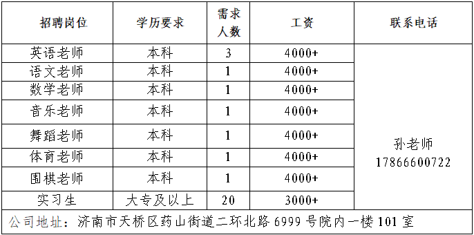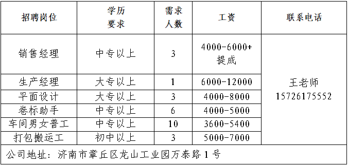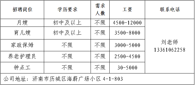 济南智趣教育科技有限公司智趣教育是一家集课程开发、师资培训、赛事举办及认证为一体的少儿综合素养运营中心;专注少儿素质课程的研发和推广,通过美式STEM教育理念,培养具有科学逻辑思维、创造力和拥有自热科学知识与动手创新能力的未来领先型人才。济南市育恩家庭服务有限公司济南市育恩家庭服务有限公司深耕母婴护理专业20年,专业培训经验16年,培训母婴育婴产康学员、安置外来务工,培养专职专项服务人员。山东万泰印业有限公司山东万泰印业有限公司是一家从事精美包装、摄影、创意、设计、制版、印刷一站式全程服务的大型现代化印刷企业。山东三友控股集团有限公司山东三友控股集团有限公司是国内大型集设计研发、制造销售、文化旅游、运营管理、配套服务于一体的综合性文旅企业。济南雪航环保科技有限责任公司济南雪航环保科技有限责任公司成立于2010年,是集研发、生产、销售、服务一体的高新企业。企业报名参加招聘,求职者咨询更多招聘岗位信息请致电市人才市场:★济南人才市场(地址:经十路22399号和谐广场东200米)联系人:胡老师 联系电话:0531-85800632