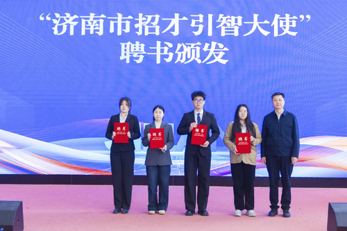 市人力资源社会保障局党组成员、副局长陈明远为“济南市招才引智大使”颁发聘书,前移引才宣传阵地,现场播放城市人才宣传片及主题曲MV,宣讲人才政策,企业代表推介人才岗位,在济校友代表现身说法,从不同角度展现济南的产业活力与人才吸引力。