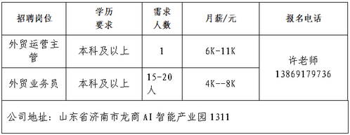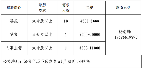润世控股有限责任公司成立于2020年,是经工商登记注册、专注于非金融性项目投资、资产管理、企业/个人投融资服务、产业整合与财务顾问的专业化、综合性投资管理机构。深圳万科祥盈管理服务有限公司青岛分公司深圳万科祥盈管理服务有限公司(简称企业服务事业部)是万科集团旗下专注于为客户提供战略、咨询、数字、技术和运营服务及解决方案帮助客户实现具有价值的业务发展及变革,提高客户的绩效水平,通过专业的服务和质量助力客户业务的发展,并致力于成为一流的企业服务运营商。济南第二汽车配件有限公司济南第二汽车配件有限公司是一家以生产重型汽车配件、柴油机配件、棉花加工机械零部件为主的综合性机械加工企业,成立于2000年3月。现占地面积5.7万平米,其中,建筑面积3.8万平米。注册资金2005万元;现有员工160余名,是长清区机械制造的骨干企业。北京恒昌世通机械销售有限公司北京恒昌世通机械销售有限公司是专门从事高端精密数控机床和工业自动化生产线产品设计、研发、制造的企业,制造工厂位于山东省威海市经济技术开发区。石家庄氐宿企业管理咨询有限公司石家庄氐宿企业管理咨询有限公司成立于 2010 年 6 月,是经中华人民共和国工业和信息化部审核,且通过 ISO9001 标准质量管理体系认证、ISO27001 信息安全管理体系认证的专业金融服务公司。山东鹰马机械设备有限公司本公司是一家深耕汽车后市场的工贸一体实力企业,办公地点在济南高新万达商务核心区,坐拥成熟完备的生产供应链体系,且已在阿里国际站积累稳定运营根基与海外客户资源。公司主营汽车烤漆房、家具烤漆房等汽保产品,为响应公司海外业务深化拓展战略,现全面启动多平台布局计划,重点打造海外社交媒体矩阵与独立站生态,构建 “多渠道、广覆盖、高转化” 的海外营销网络。济南望君安信息咨询有限责任公司我司是一家深耕本地,注重品质的服务公司。家政业务部,全新出发,核心团队均有多年家政行业实践经验。覆盖日常保洁、开荒保洁、月嫂等全品类一站式闭环服务。企业报名参加招聘,求职者咨询更多招聘岗位信息请致电市人力资源市场:★ 济南市人力资源市场(地址:历城区七里河路2-2号)联系人:王老师 联系电话:0531-61317807