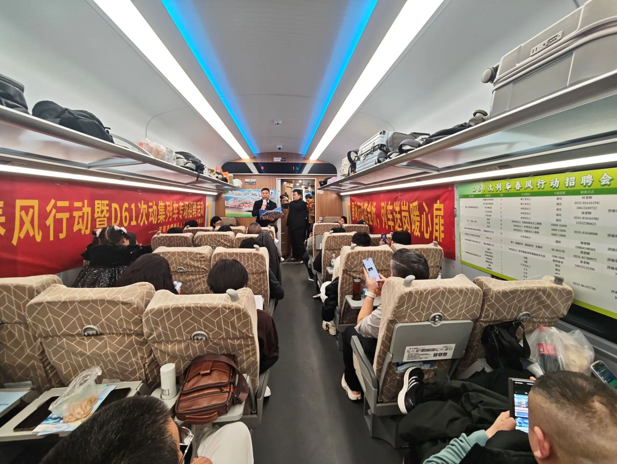 此次活动是槐荫区人社局联合国铁济南局济南客运段首次尝试在列车上举办招聘会及政策宣讲活动,以济南至宁波D61次动集列车为移动招聘阵地,精准对接春运期间旅客求职需求与企业用工需求,旨在为返乡人员提供暖心就业服务,为服务保障节后辖区重点企业用工做好准备。