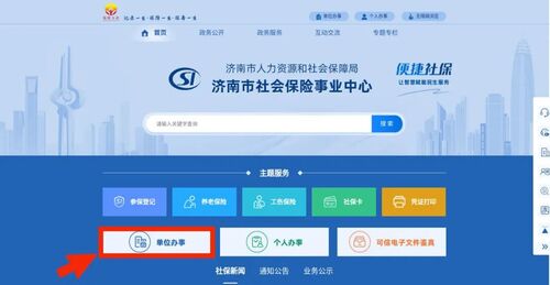 1、登录济南市社会保险事业中心官网,点击进入“单位办事”: