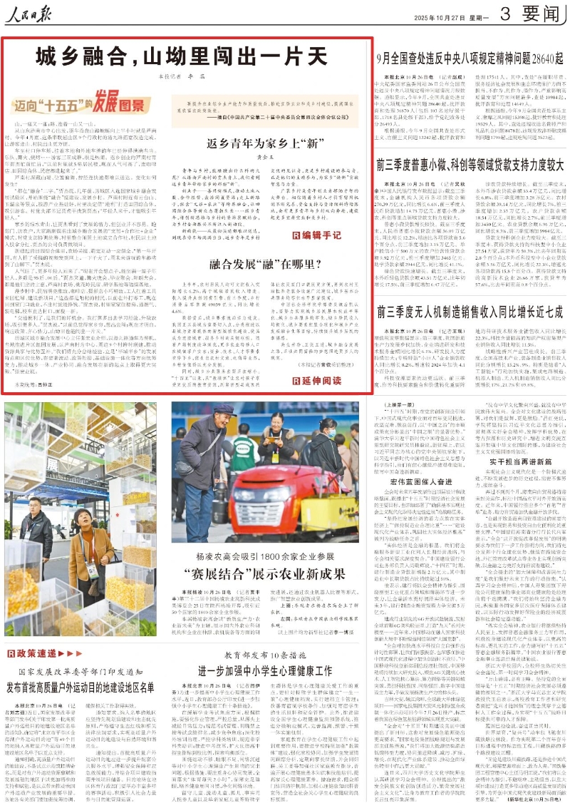 10月27日,《人民日报》以《城乡融合,山坳里闯出一片天(迈向“十五五”的发展图景)》为题,报道了济南市积极推进返乡创业、带动实现“家门口”就业的实践做法。