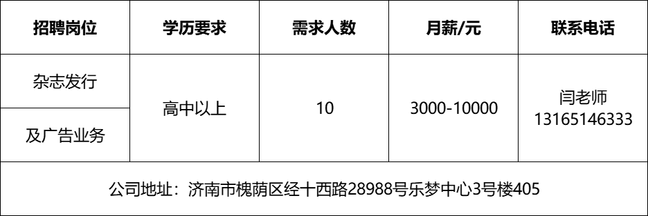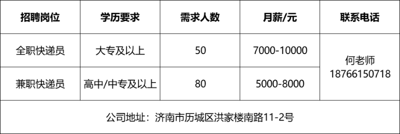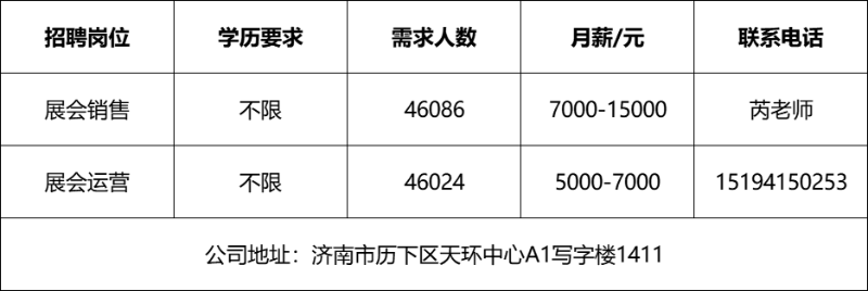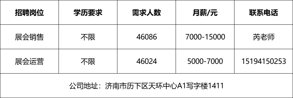 招聘信息山东青青教育科技有限公司山东青青教育科技有限公司主要经营范围:教育咨询服务(不含涉许可审批的教育培训活动);组织文化艺术交流活动;个人商务服务;市场营销策划;企业管理咨询等。招聘信息济南雪航环保科技有限责任公司济南雪航环保科技有限责任公司成立于2010年,是集研发、生产、销售、服务一体的高新企业。招聘信息山东顺丰速运有限公司顺丰于1993年成立于广东顺德,本部位于中国深圳。顺丰提供国内及国际端到端一站式综合物流解决方案,包括时效快递、经济快递、快运、冷运、及医药、同城即时配送、供应链及国际(含国际快递、国际货运及代理、供应链)等物流服务。招聘信息山东思创国际会展有限公司山东思创国际会展有限公司是会展行业服务商,现拥有:济南链宠会、郑州宠物展、西安宠物展、青岛宠物展等全国宠物系列展、北京餐饮采购展览会、沈阳餐创展、济南好餐饮食材展、华餐会-世界餐饮企业家俱乐部、国际行政总厨排名邀请赛、新京菜创新大赛、跨界考察等服务项目。招聘信息山东心宁方舟教育咨询有限公司是一家专注于心身健康领域的管理机构,致力于为个人和企业提供全方位的身心健康解决方案。招聘信息济南城市之窗广告有限公司《金属周刊》成立于2003年,主要面对钢材及不锈钢市场,立足济南,覆盖鲁豫皖苏津晋冀,辐射东北及西北地区,是国内发行量最大,覆盖面最广,经营时间最长的行业类信息杂志。欢迎咨询企业报名参加招聘,求职者咨询更多招聘岗位信息请致电市人才市场:济南人才市场(地址:经十路22399号和谐广场东200米)联系人:胡老师 联系电话:0531-85800632