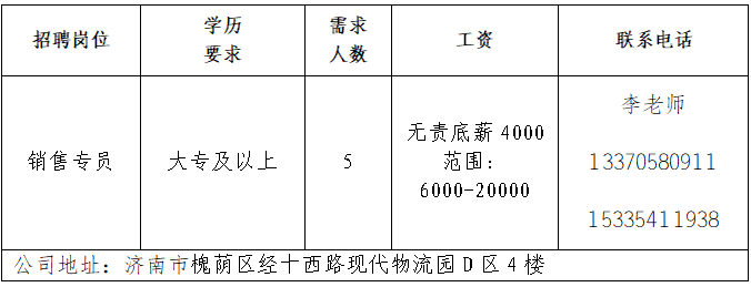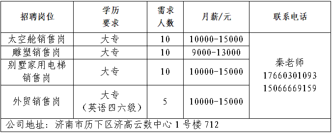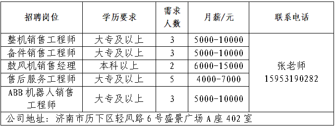 山东三友控股集团有限公司山东三友控股集团有限公司是国内大型集设计研发、制造销售、文化旅游、运营管理、配套服务于一体的综合性文旅企业。济南锐博特机械设备有限公司济南锐博特机械设备有限公司成立于2010年3月18日,为美国英格索兰空压机、真空泵、GD格南登福鼓风机等全系列产品授权代理商、ABB机器人山东省授权服务商。济南雪航环保科技有限责任公司济南雪航环保科技有限责任公司成立于2010年,是集研发、生产、销售、服务一体的高新企业。济南智趣教育科技有限公司智趣教育是一家集课程开发、师资培训、赛事举办及认证为一体的少儿综合素养运营中心;专注少儿素质课程的研发和推广,通过美式STEM教育理念,培养具有科学逻辑思维、创造力和拥有自热科学知识与动手创新能力的未来领先型人才。山东崇文教育咨询有限公司崇文教育品牌起源于2013年9月,拥有独立知识产权和十余年发展的历史,是山东省连锁资深教育品牌,业务覆盖出国留学、央国企 就业、军队文职招考培训等。山东鼎信立业贸易有限公司山东鼎信立业公司成立于2009年,是一家从事钢材营销的钢材实业公司。企业报名参加招聘,求职者咨询更多招聘岗位信息请致电市人才市场:济南人才市场(地址:经十路22399号和谐广场东200米)联系人:胡老师 联系电话:0531-85800632
