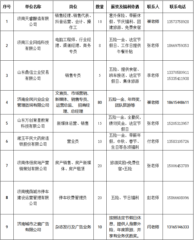 届时济南天睿酿造有限公司、济南三业网络科技有限公司等知名企业现场招贤纳士,职位涵盖会计、电脑工程师、销售经理、新媒体运营、杂志发行及广告业务等各类岗位350多个。活动当日,同时开展AI直播带岗(扫码上线观看)。
