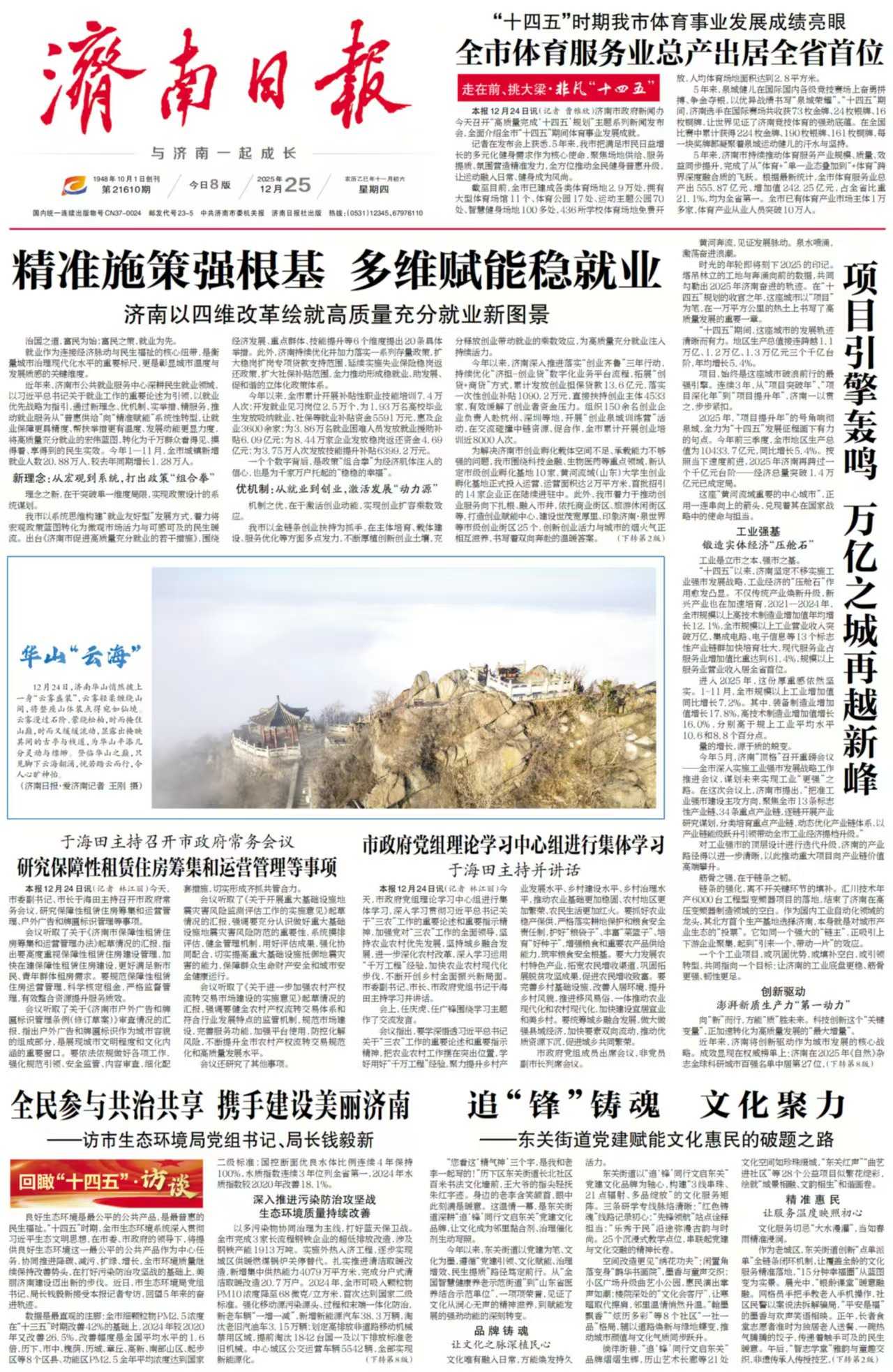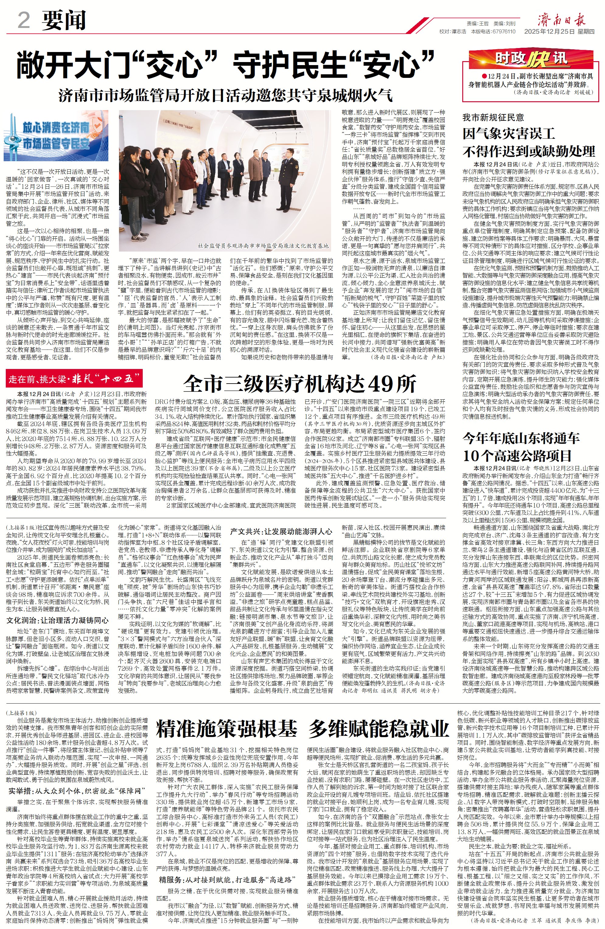 12月25日,《济南日报》头版头条以“精准施策强根基 多维赋能稳就业——济南以四维改革绘就高质量充分就业新图景”为题,点赞报道我市就业工作。