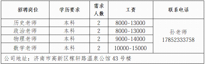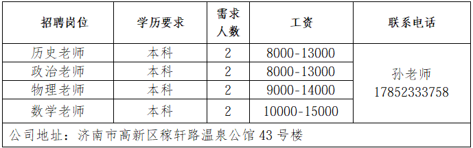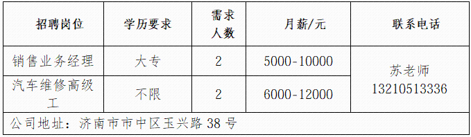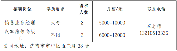 济南书径同舟教育咨询有限公司成立于 2007 年,是济南高新区正规民办托管学校,专注初高中学生托管与文化课辅导。济南鲁岳汽车服务有限公司济南鲁岳汽修厂是一家有着20年汽车维修的公司,是济南市一类汽车维修行业资质,山东省和济南市公务车定点维修单位。山东三友控股集团有限公司山东三友控股集团有限公司是国内大型集设计研发、制造销售、文化旅游、运营管理、配套服务于一体的综合性文旅企业。山东鼎信立业贸易有限公司山东鼎信立业公司成立于2009年,是一家从事钢材营销的钢材实业公司。济南雪航环保科技有限责任公司济南雪航环保科技有限责任公司成立于2010年,是集研发、生产、销售、服务一体的高新企业。企业报名参加招聘,求职者咨询更多招聘岗位信息请致电市人才市场:济南人才市场(地址:经十路22399号和谐广场东200米)联系人:胡老师 联系电话:0531-85800632