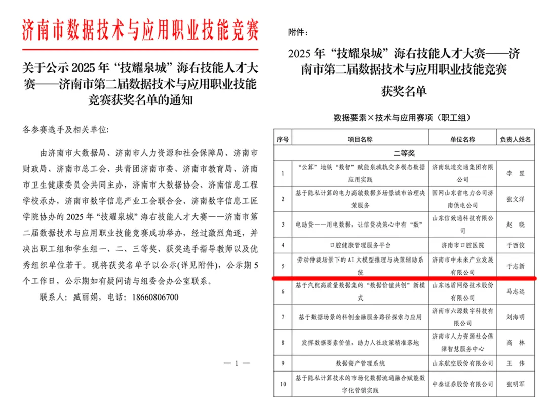 一是线索归集“一网通办”,实现快速响应。开发劳动监察三方线索管理平台,整合12345热线、“安薪码”等渠道线索,实现“一站归集、自动分流、区街闭环”。平台上线后,线索响应时间从48小时压缩至24小时内,响应速度提升30%。二是仲裁办案“智慧升级”,压缩办理周期。上线智慧仲裁系统,实现“线上立案、电子送达、智能文书”全流程数字化。系统通过“机器初筛+人工复核”过滤无效申请,内置100余种法律文书模板自动生成裁决书,办案人员文书撰写时间缩短60%,劳动仲裁AI应用获济南市第二届数据技术与应用职业技能竞赛二等奖。今年以来,线上立案占比达45%,平均办案周期从45天压缩至30天,实现群众办事“少跑腿、零跑腿”。三是政策服务“精准推送”,延伸便民触角。联合联通公司推出人社政务服务电话语音导航系统,群众通过咨询电话“87599919”,可按语音提示获取答案或转接业务科室,7×24小时提供政策咨询和精准转接服务。系统上线以来,已累计服务群众2000余人次。