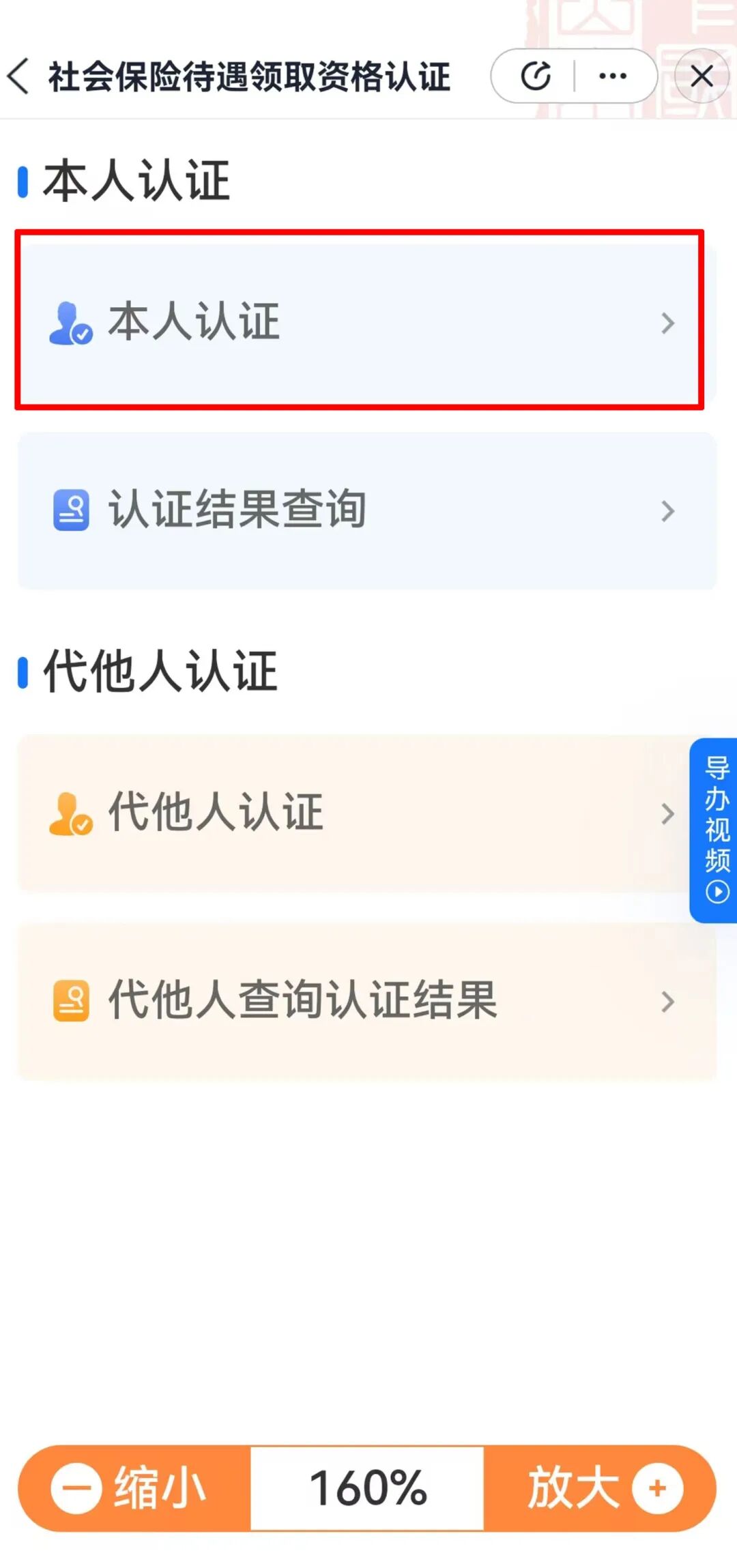 认证即将到期的待遇领取人员,可以通过上述途径进入认证界面选择“本人认证”,根据提示通过人脸识别完成认证。