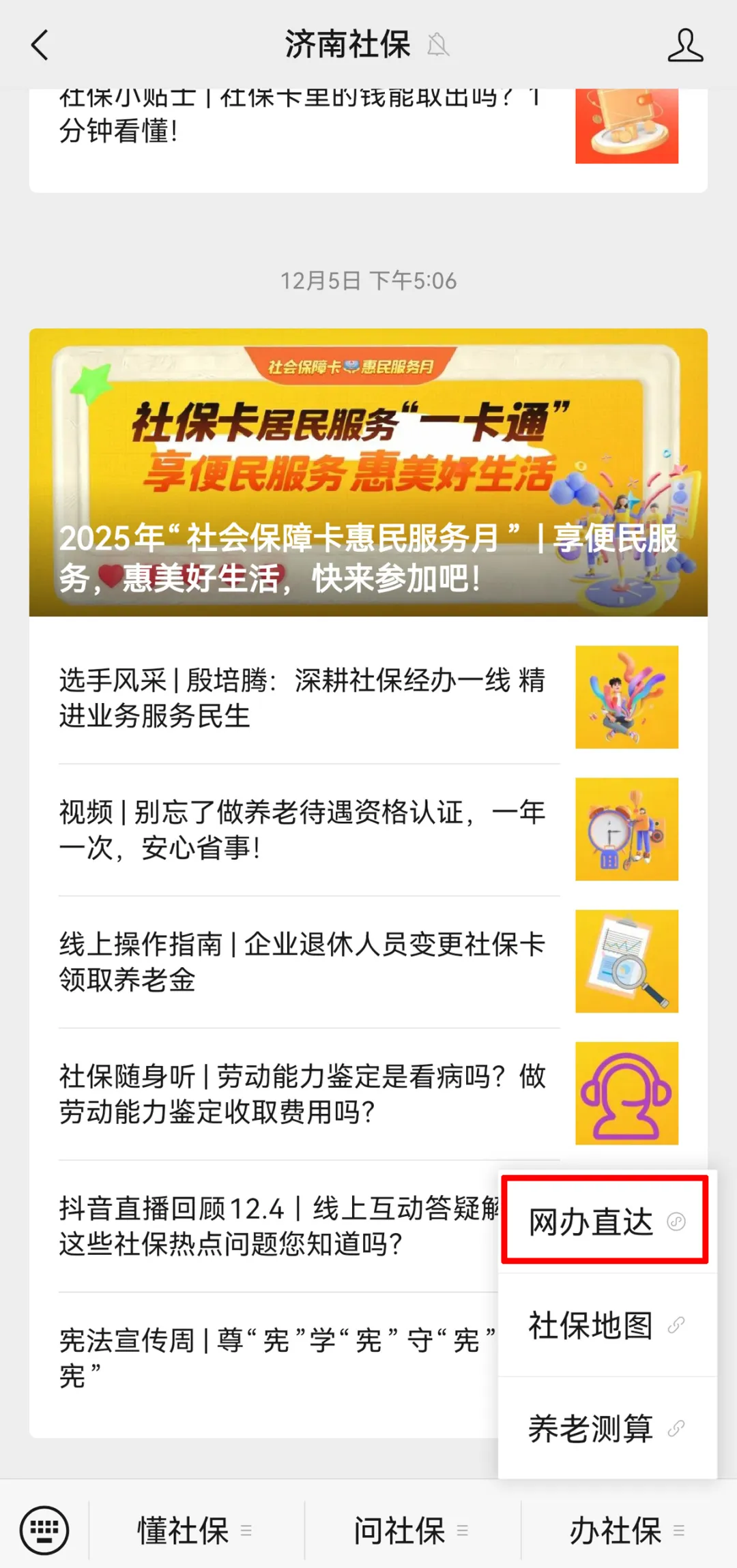 途径二:“济南社保”微信公众号:微信关注“济南社保”公众号,点击右下角“办社保”-“网办直达”,在场景化服务中找到“我要办认证”,进入认证界面,点击“认证结果查询”,即可查询您上一次认证记录的时间,以及认证有效期限。