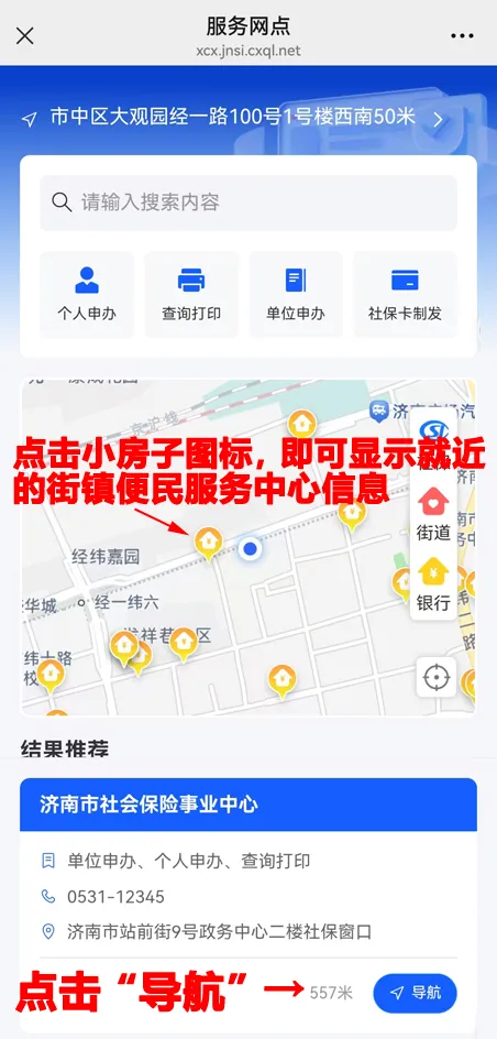 认证完成后,您的认证记录和下一次认证时间也随之更新。除了线上认证方式外,持有效身份证件到您就近的街镇便民服务中心也可办理线下认证:点击“济南社保”微信公众号右下角“办社保”-“社保地图”,授权位置权限,选择显示的所在位置附近的街镇便民服务中心,点击图标即可直接地图导航前往。