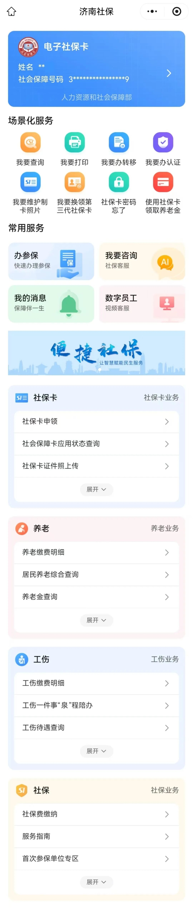 网办直达:这是济南社保的线上业务核心办理区。场景化服务:足不出户办理社保相关业务,如查询参保信息、打印缴费证明、办理社保关系转移、换领第三代社保卡等。常用服务:“灵活就业人员参保登记”直达通道,个人参保轻松办;“我要咨询”一键联系社保智能客服;“数字员工”视频客服为您解答疑惑。业务专栏:集成办理社保卡、养老、工伤等社保专项业务。