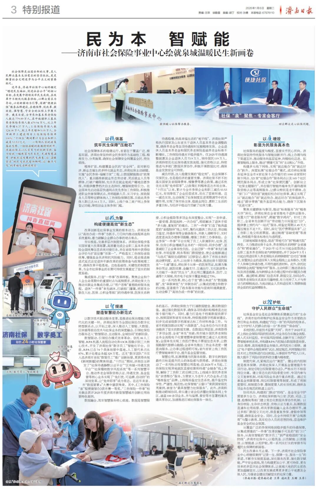 《济南日报》2026年1月6日第003版“特别报道”发布专版专面,以《民为本,智赋能——济南市社会保险事业中心绘就泉城温暖民生新画卷》为题,进行了深度报道。